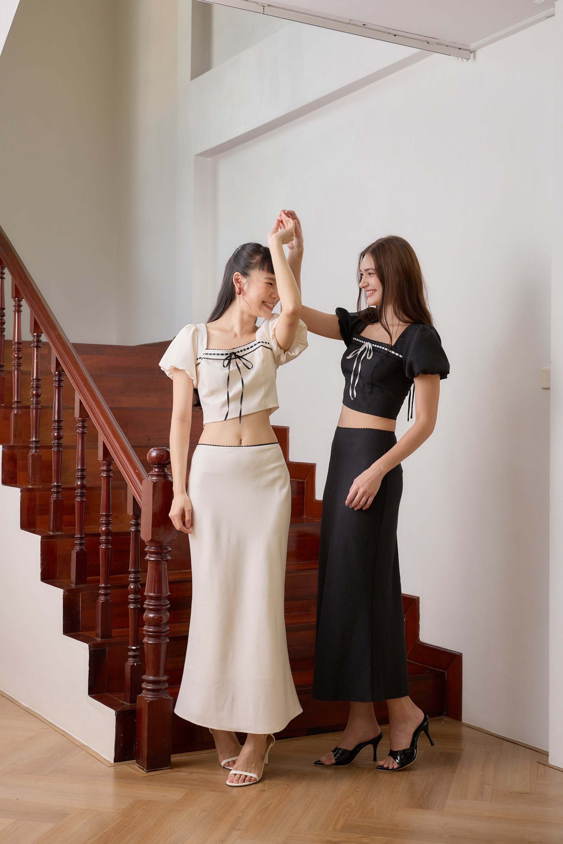 A chic midi skirt edged with delicate contrast lace trim for a feminine touch.