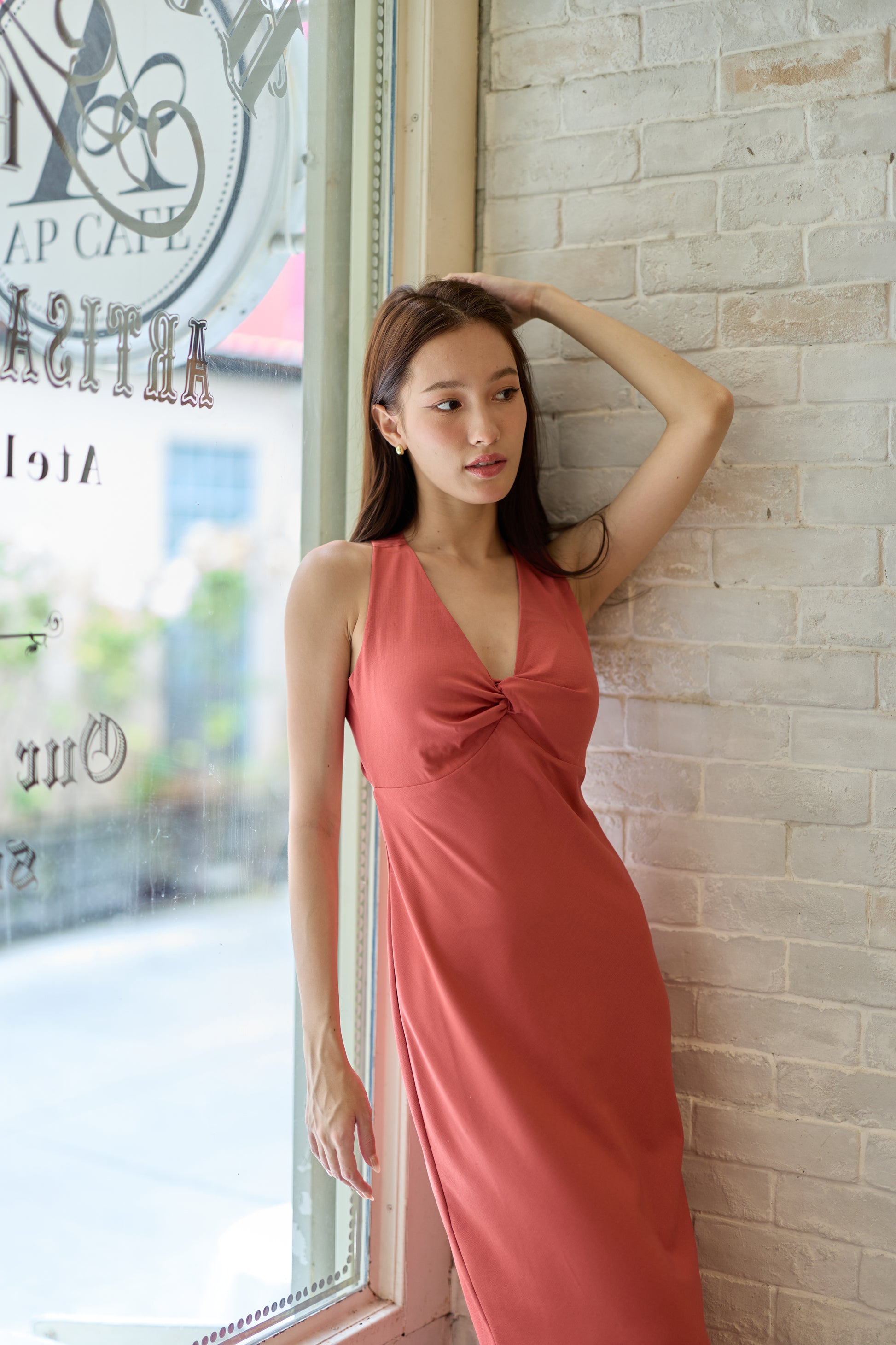 Effortlessly chic, this twist-front midi dress features a flattering low back and subtle padding for a smooth, supportive fit.