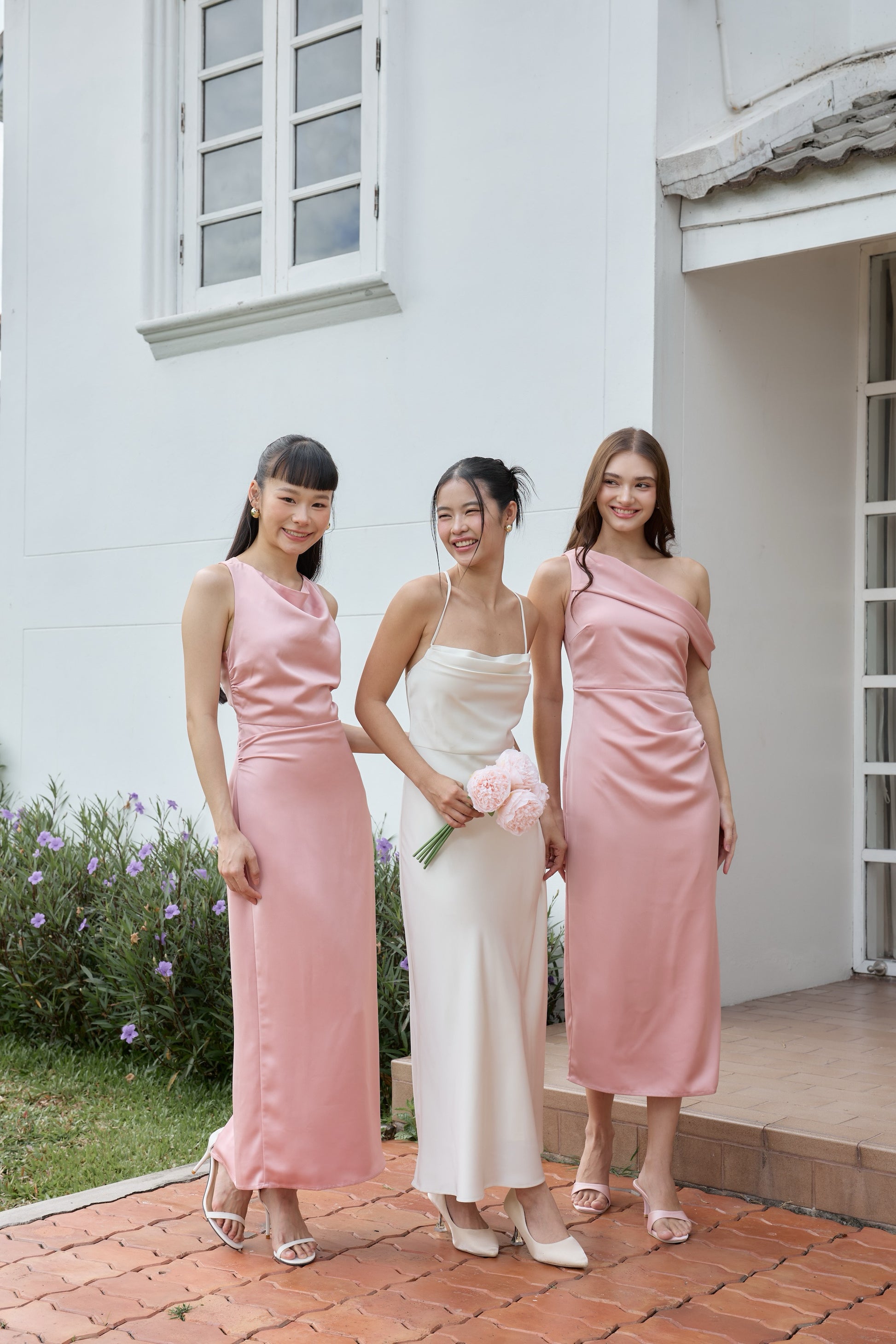 This dress features a draped cowl high neckline and an elegant twist-back detail. Gentle side ruching at the waist creates a flattering, figure-skimming shape, complemented by a back slit for ease of movement. Finished with a concealed back zip for a smooth, seamless fit.