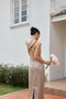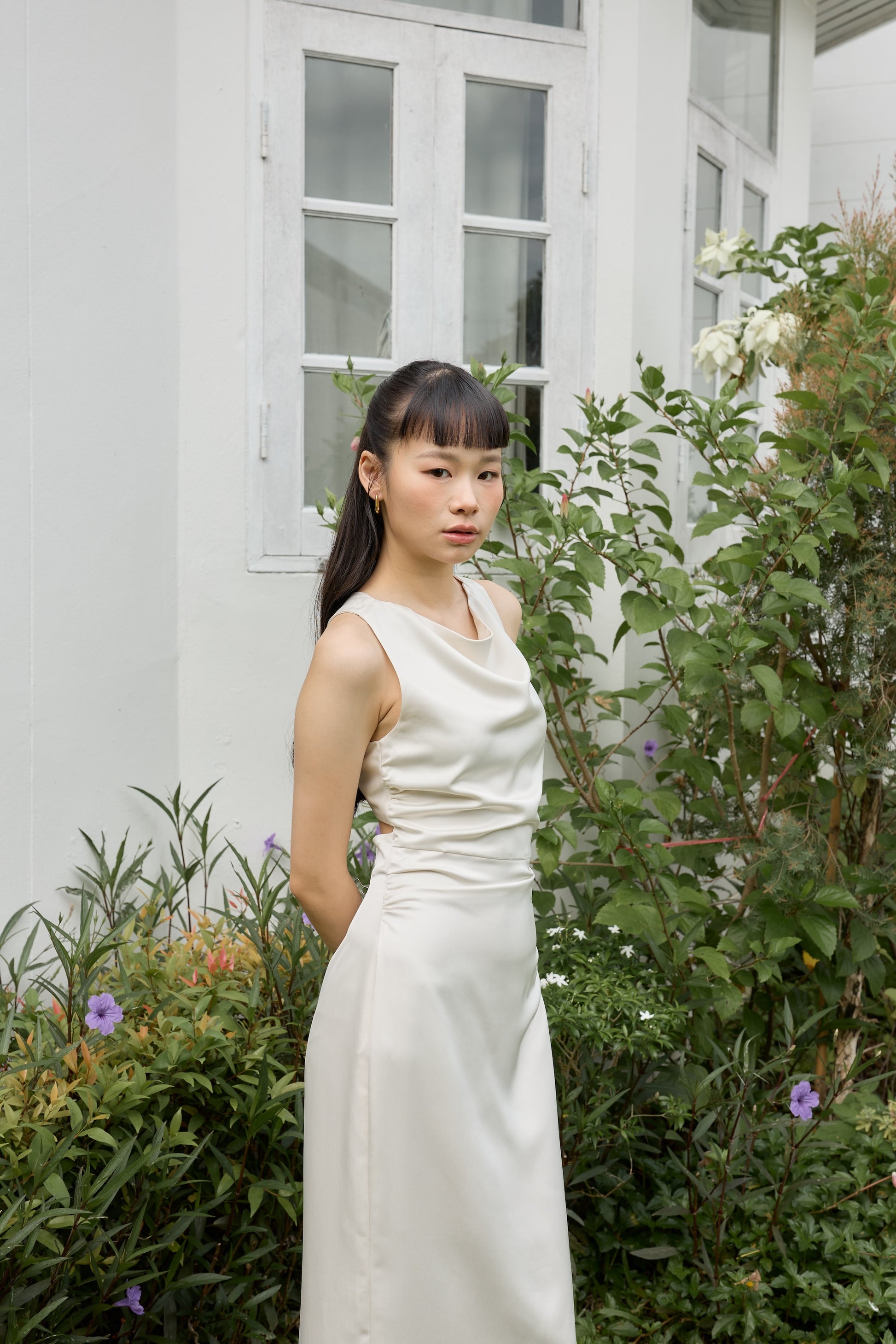 This dress features a draped cowl high neckline and an elegant twist-back detail. Gentle side ruching at the waist creates a flattering, figure-skimming shape, complemented by a back slit for ease of movement. Finished with a concealed back zip for a smooth, seamless fit.